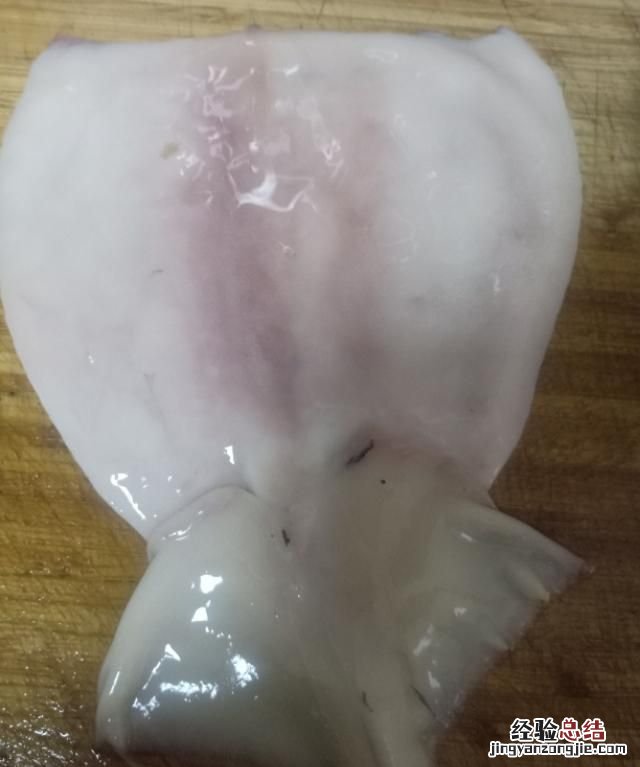 去表皮1:这个表皮是鱿鱼的保护膜,在鱿鱼背部,有一定毒性,还会影响菜的品质,所以要去掉 。方法:我一般是将2个鱿鱼足片先扯下来,先清除足片附近的表皮