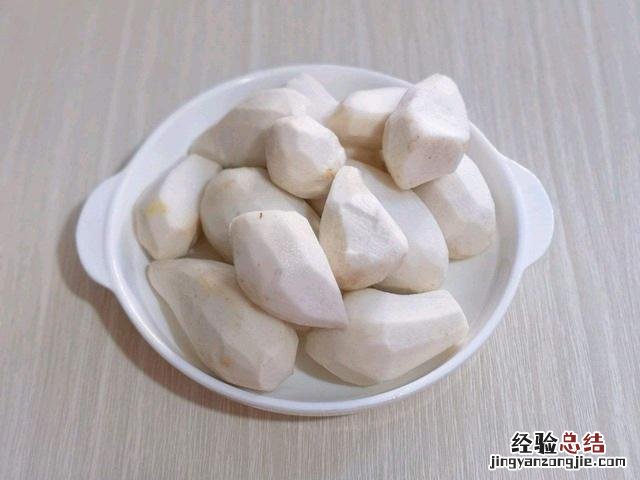 2、把所有芋头都去皮之后备用 , 从中间一分为二,方便入味;