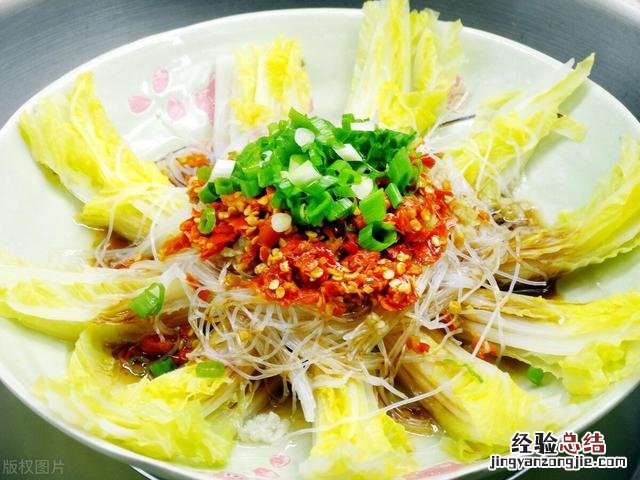 3、把焯好水的娃娃菜摆到盘中,摆好娃娃菜后 , 焯水后的粉丝摆在中间;