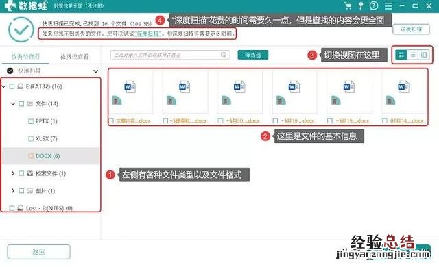 在扫描结果页面,你可以看到左侧的各种文件类型以及格式,右侧是文件的基本信息 , 上侧是文件的切换视图,切换视图有缩略图、详细信息、内容,你可以根据自己的需要选择预览文件方式 。