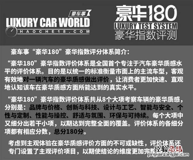 “豪华180”豪华指数评分体系满分为180分 , 根据最终得分分为:不够豪华(90分以下)、入门豪华(90-109分)、足够豪华(110-129分)、非常豪华(130-159分)、顶级豪华(160-180分) 。