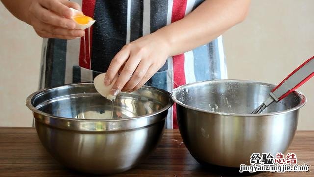 步骤四:准备一个无油无水 , 深一点的盆,把鸡蛋的蛋清蛋黄分离 , 蛋清打入无油无水的盆中,蛋黄直接放入之前调好的面粉糊中 。