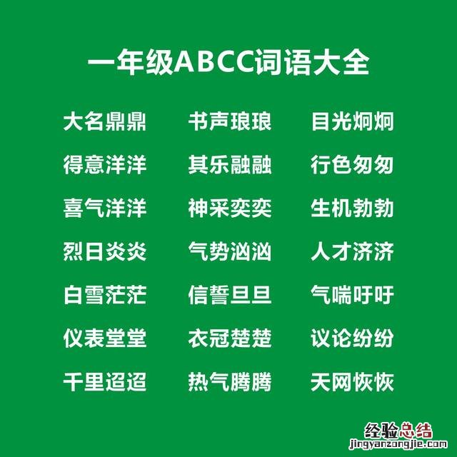 一年级我们开始学习ABCC词语了,ABCC词语是指前两个字相同,后两个字不同的四字词语,主要表现在四字成语方面 。一年级常用的ABCC成语比如有:生机勃勃,喜气洋洋,气势汹汹,得意洋洋,白雪皑皑,其乐融融,大名鼎鼎,气喘吁吁,天网恢恢等 。