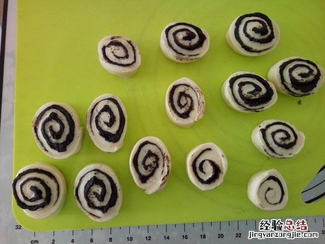 7.取出面包机的搅拌刀 , 在底部排放5个切开的面团 。