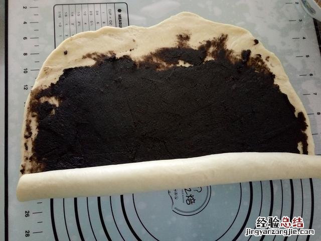 5.面团擀开成薄片,抹上豆沙,卷起来 。
