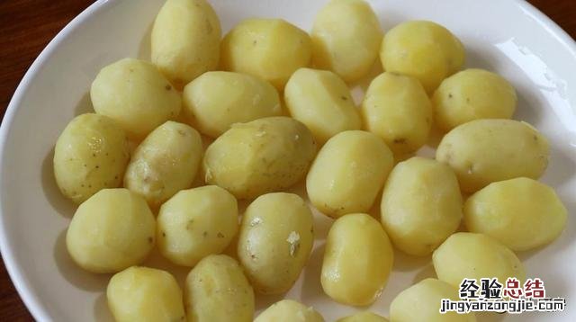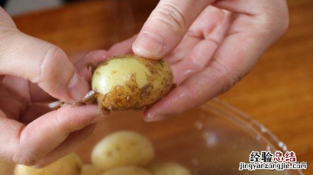煮到小土豆能轻松剥掉外皮后,捞出,放入凉水中投凉,然后剥掉小土豆表面的皮 。