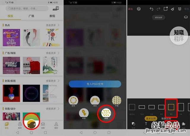 2. 选择《图痒》app 中的「拼图」功能;设置「比例」为 1:1 。