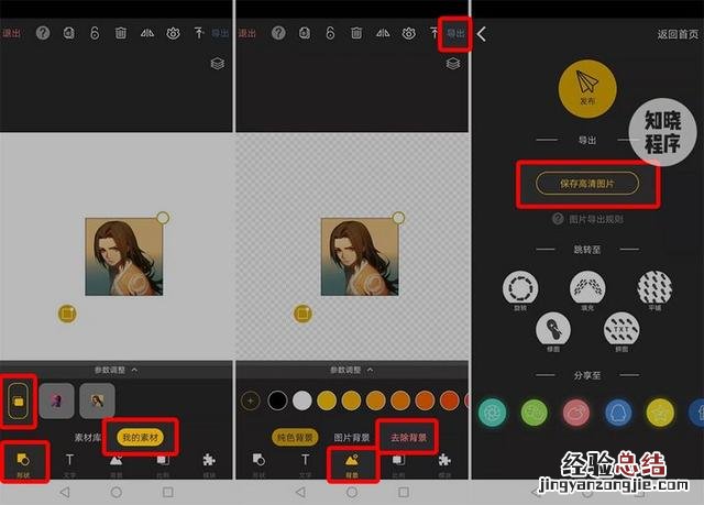 3. 选择「形状」,点击「我的素材」 , 导入一张头像 。导入后不用对图片做任何操作,选择「背景」,点击「去除背景」后「导出」并「保存高清图片」即可 。