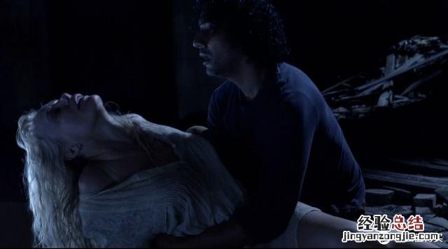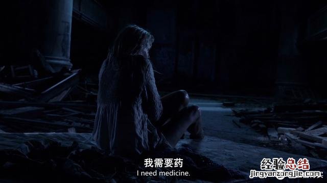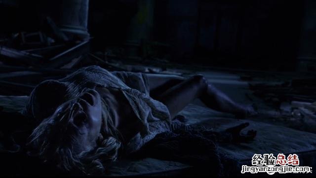 一个女人躺在废墟上,她的手突然间像是被人举起来,但是旁边并没有人 。