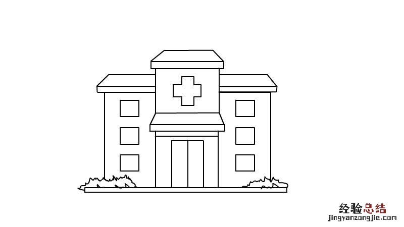 1、画出医院的大致形状 , 左右两边画上草丛 。