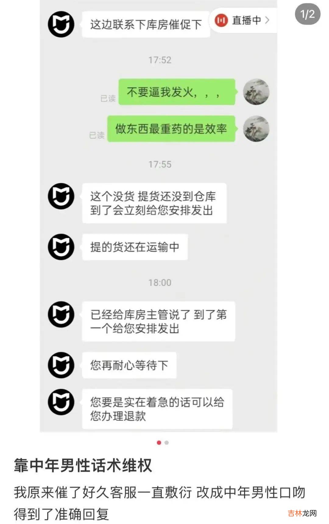 网购平台上商家一直不发货 , 去询问还遭到客服的渣男式敷衍 , 而她采用了中年男子话术 , 教育客服“做东西最重药的是效率” , 配合错乱的标点 , 终于得到了一个明确的回复 。