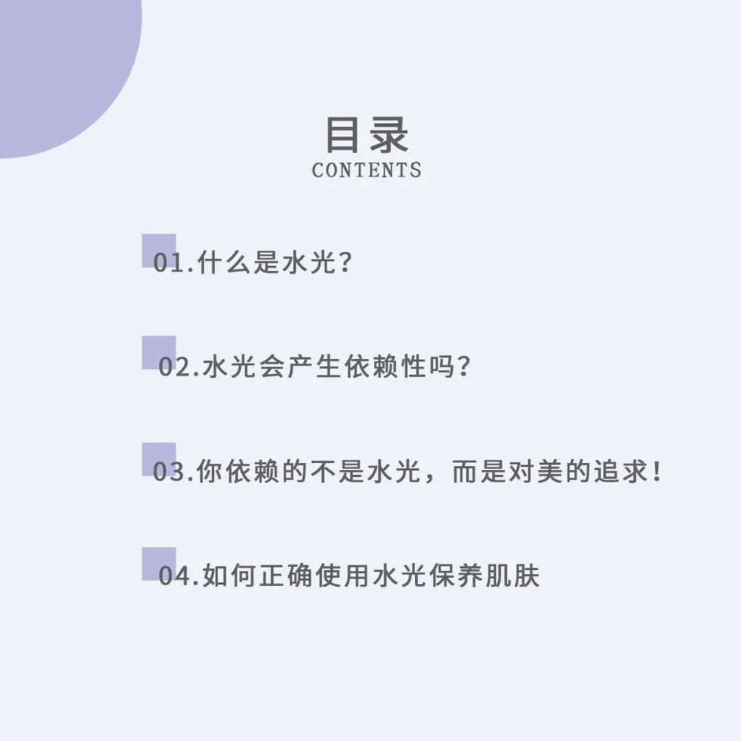 肌肤衰老是一个长期的过程 , 同样的 , 皮肤维养也是一个长期的过程 , 水光作为日常护肤以外的高端保养方式 , 通过直接导入的方式将营养精华成份直达真皮层 , 带给求美者更轻松有效的求美体验 , 吸收率更是普通涂抹的10倍以上 , 因此 , 使用水光可以有效保湿补水 , 改善肌肤 。 当你使用水光后发现自己的皮肤转态好转之后 , 会迫不及待使用第二次、第三次等 , 这种依赖性并非水光造成 , 而是大众对美的追求 。 你见过自己美的时候 , 你只希望自己能一直美下去~