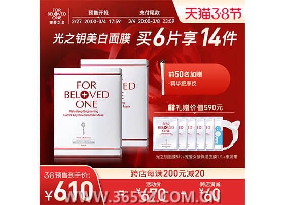 推荐理由:产品价值:1255元 , 到手价:610元;抢先预售时间:2.25-3.4日 , 正式:3.5 20:00-3.8日 , 每满200-20元;活动:预付定金加赠宠爱女孩面膜1片 , 前50名抢先下单再加赠精华按摩仪一个 。