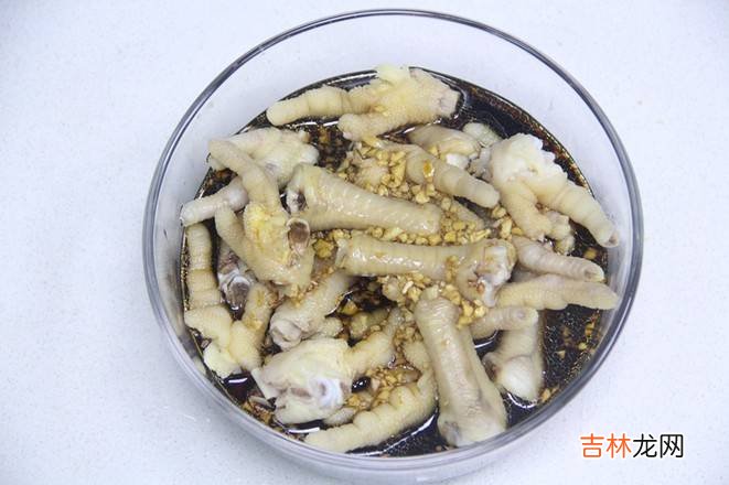 7、鸡爪冷却后,控干水分,把调好的酱料倒入鸡爪中 。
