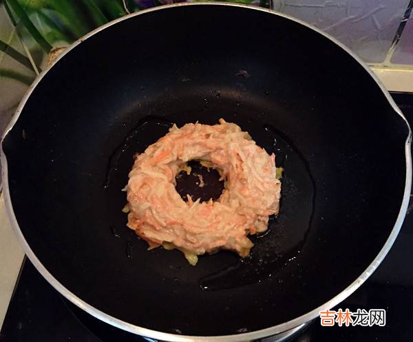 4、不粘锅中抹上一层油 , 舀入1大勺土豆丝 , 从中间挖个洞摆成圆形状 。