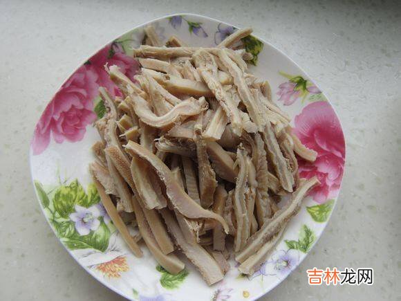 2、把熟牛肚洗净,去掉牛肚上的筋,用开水加八角料酒香叶煮20分钟左右捞起切丝 。