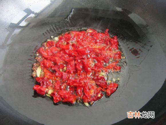 6、热锅凉油加花椒粒姜辣皮子炒出香味 。