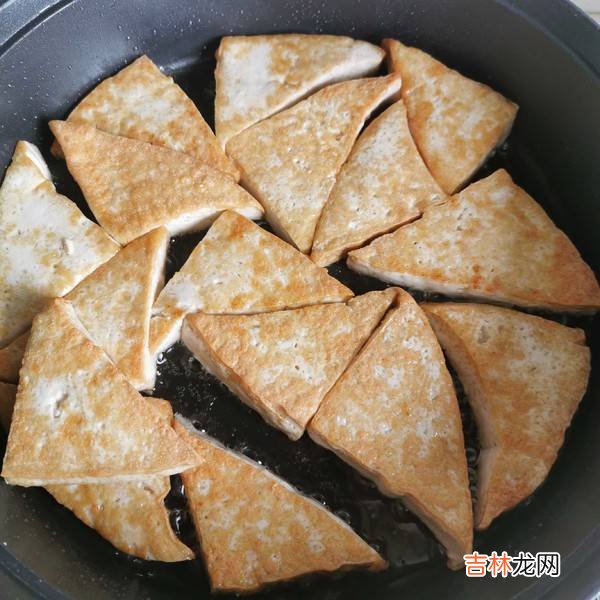2、锅中放油,放入切好的豆腐,煎至两面金黄 。