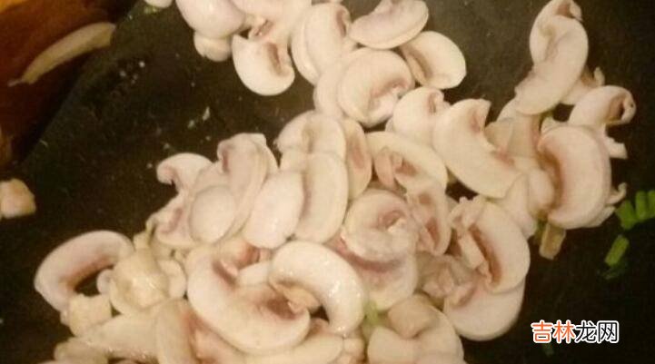 2、锅中放油,待油热,放葱爆香,倒入蘑菇翻炒加入少量料酒 。