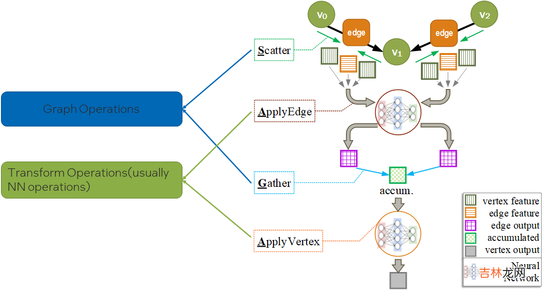 分析一下 , 会发现 , SAGA模式中ApplyEdge和ApplyVertex是传统deep learning中的NN(Neural Network)操作 , 我们可以复用;而Scatter和Gather是GNN新引入的操作 。即 , Graph Computing = Graph Ops + NN Ops 。