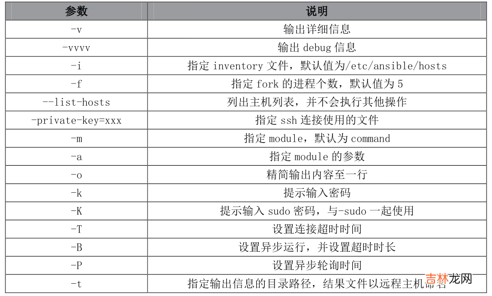 Ansible 命令讲解Ansible 命令集# 以下所有命令均可使用`-h`参数获取帮助信息ansible# Define and run a single task 'playbook' against a set of hosts# 常用命令ansible-config# View ansible configuration.ansible-console# REPL console for executing Ansible tasks.# 交互式工具,相当linux中的shell,不常用ansible-doc# plugin documentation tool# 查询模块的文档说明,类似linux中的man,常用命令ansible-galaxy# Perform various Role and Collection related operations.ansible-inventory# Show Ansible inventory information, by default it uses the inventory script JSON formatansible-playbook# Runs Ansible playbooks, executing the defined tasks on the targeted hosts.# 执行系列任务,类似linux中的sh,常用命令ansible-pull# pulls playbooks from a VCS repo and executes them for the local hostansible-vault# encryption/decryption utility for Ansible data filesAnsible 常用命令集# 常用命令集ansible# Ansible指令的核心部分,主要用于执行ad-hoc命令,也就是单条命令# 默认使用command模块,默认的使用模块可以在ansible.cfg中进行定义ansible-doc# 用于查看模块信息,# 参数 -l 列出可用的插件# 参数 -s 用于查看指定模块的用法,例如“ansible-doc -s shell”ansible-playbook# 读取playbook文件内容并执行定义的任务# 对于固化的需求通常采用playbook方式定义和实现ansible-vault# 主要应用于包含敏感信息的场景,可以加密和解密敏感信息# 经过加密后的playbook,编辑时需要输入事先设定的密码才能打开# 使用 --ask-vault-pass 参数执行加密后的playbook文件ansible-config# 查看ansible的配置# 参数 list 打印所有配置参数,参数 view 查看配置文件# 结合 grep 使用可以获取具体配置信息,例如“ansible-config view |grep -v "#" |grep host_key_checking”Ansible ad-hoc命令# ansible <host-pattern> [-f forks] [-m module_name] [-a args]# <host-pattern>命令生效的主机: <inventory_group_name>/<inventory_host_ip>/all # 常用选项通过 ansible -h 命令获取详细信息-v# 输出详细执行过程信息verbose mode (-vvv for more, -vvvv to enable connection debugging)-i inventory_file# 指定inventory文件,默认为/etc/ansible/hosts-f forks# 指定并发线程数(一次处理多少个主机),默认5个线程-m module_name# 指定执行使用的模块-M directory# 指定模块存放路径,默认为/usr/share/ansible-a args# 指定模块参数-l hosts_ip# 限定主机(只在限定主机上执行任务)--become-method BECOME_METHOD# 提权方法,默认为sudo,一般为su--become-user BECOME_USER# 切换用户,默认为root-K, --ask-become-pass# 请求提权密码--list-hosts# 列出此次的主机列表,但不做任何改变--syntax-check# 语法检查-C, --check# 检验可能的错误,但不做任何改变# 主机名文件保留- "-t"或"--tree"选项可以将ansible的执行结果按主机名保存在指定目录下的文件中- 使用"-t"选项可以将第一次执行的结果按主机名保存在文件中,此后即使不使用"-t"选项也能提升执行速度# 命令示例ansible 192.168.56.3 -a 'hostname'# 默认使用command模块(不支持变量、管道等)ansible 192.168.56.3 -m command -a 'hostname'ansible Test --list# 列出Test组所有的主机列表ansible Test:Test2 -m ping# 通过ping模块检查Test组和Test2组的主机是否存活ansible Test:!Test2 -m ping# 在Test组但不在Test2组的主机ansible Test:&Test2 -m ping# 同时存在Test组和Test2组的主机ansible Tes* -m ping# 组名开头为Tes的主机ansible all -m shell -a 'hostname && date'# 通过shell模块在所有主机试行shell命令ansible all -f 10 -m shell -a 'hostname && date;cat /etc/system-release'# shell模块支持变量、管道、if判断等复杂命令部分参数如果不指定,将采用ansible.cfg中的设置值,或者采用原始默认值 。