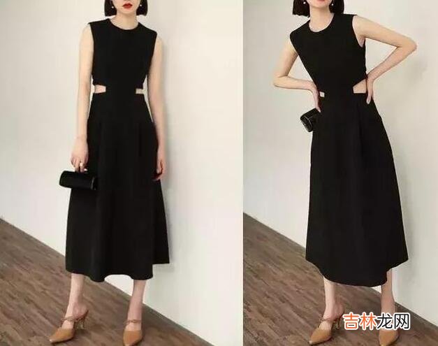搭配1》》》很气质很优雅的夏季长裙,经典的小黑裙超级百搭,腰间的镂空设计,时尚又性感,而且超级显瘦显身材,穿上身很有女神的气质,脚上搭配一双裸色的绑带高跟拖鞋,极具时尚感,再手提一个立体复古的小包包,整体超级有范 。