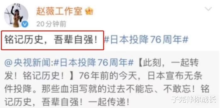 赵薇对此还是很谨慎的 , 配合官方发布8个字动态:铭记历史 , 吾辈自强!