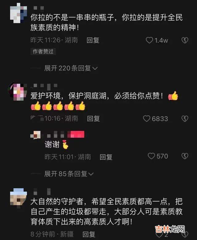 视频下方 , 网友纷纷点赞:“你拉的不是一串串的瓶子 , 你拉的是提升全民族素质的精神”“保护环境 , 保护洞庭湖 , 必须给你点赞”“美女人美心灵更美” 。 也有网友热情地给出了拉瓶子的方法:“将绳子在手指上面绕一个小圈 , 从中挑出一根形成一个活圈 , 然后套着瓶子 , 这样越拉越紧” 。