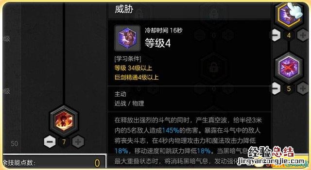 威胁虽然能够对半径3米内的敌人造成伤害,但这里点出4点的原因主要还是为了触发出血技能 , 而在个人眼中威胁的作用还是来自于它的减益效果:降低目标18%的攻击力和18%的移动跳跃力,所以该技能可以帮助狂战士更好的粘人攻击以及降低自身受到的伤害 。