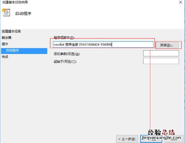 这里我选择填写程序(小写字母): rasdial 宽带连接 085431868424 936896