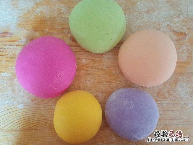 3,将面团根据想做的花型,分割成几个部分 , 每一个加入适量的对应颜色的蔬菜粉揉匀,比如绿色的菠菜粉 , 红色的红曲粉,紫色的紫薯粉 。