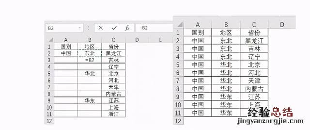 选择A~C列拆分合并后的数据区域,按Ctrl+G或者F5调出定位面板,定位空值,然后在编辑框输入“=←”,最后按Ctrl+Enter结束输入即可 。