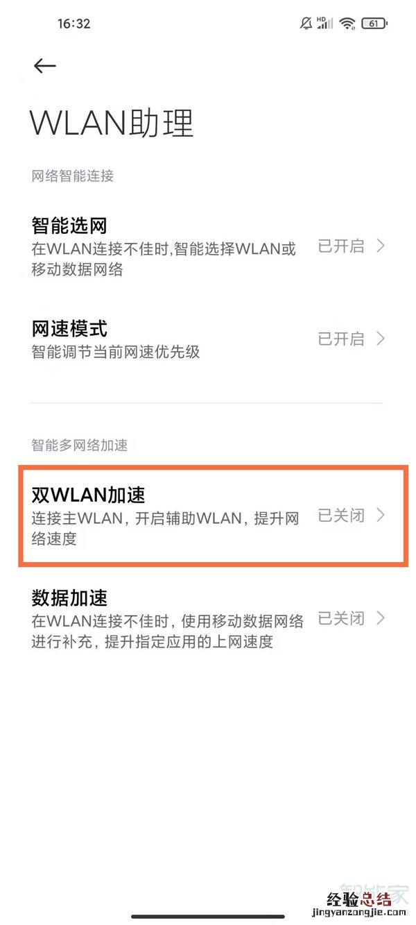 4、将【双wlan加速】的开关开启 , 选择要连接的辅助wifi即可 。