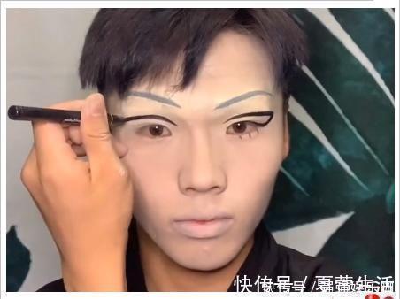 接下来这张我们能看到他已经重新把眉毛画上了,现在用眼线笔在自己的眼皮上画着两道轮廓,看起来真是让人非常看不懂了,不知道他这是想要做什么,看上去他的形象还是没什么改变的,不过这也是刚开始,我们还是继续向下看看吧!