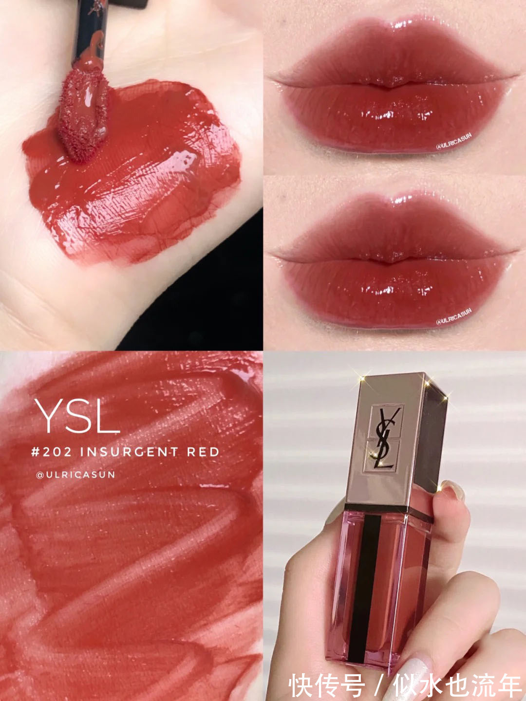 ysl202你也太好看了吧,这只色号必须人手一直好不好。清透又浓郁的伯爵红茶色,刚涂上去的时候有点橘棕调,但是氧化后红调就出来了,真的是在嘴上越久越好看的那种,很有内涵哈哈哈。