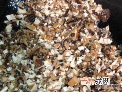 豆干香菇焯水并切丁,锅中倒入少许油,煸炒出香味,放凉备用 。