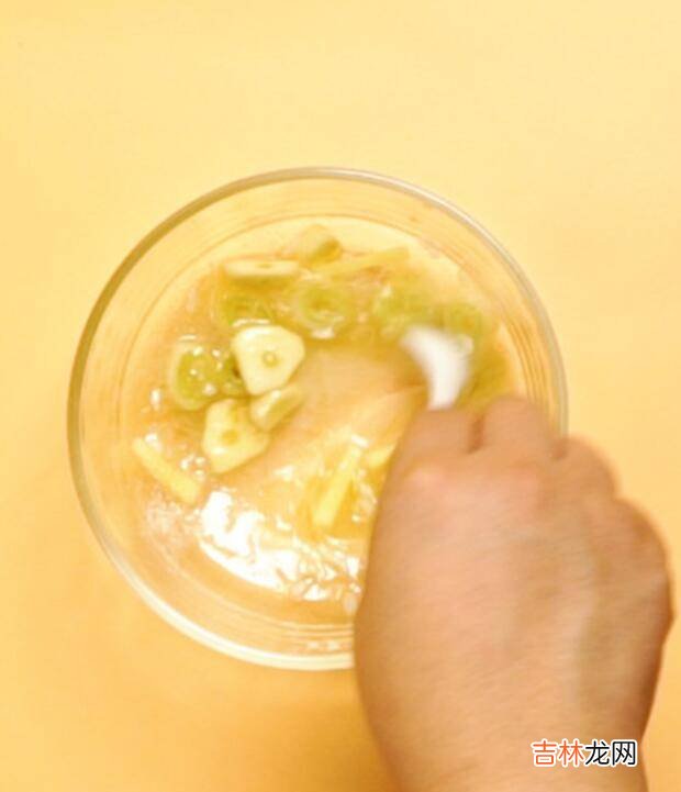 4、碗中倒入盐5克、鸡粉、胡椒粉、米酒、麻油,再倒入葱花、姜丝、蒜片,搅拌均匀即可 。