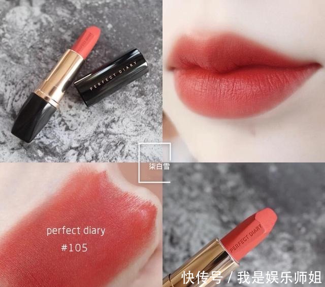 2、完美日记小黑钻105奶橘调的珊瑚色,颜色很淡的一支,涂上也还是很有元气,春天这支颜色真是太合适了,很清新的颜色。薄涂是奶橘调的奶茶色感,厚涂就是很活泼元气的珊瑚色。105有一点点土调压着所以上嘴也不会荧光,黄皮绝对没问题。哑光的质地遮盖力也很强,深唇也可以涂,很高级的颜色。