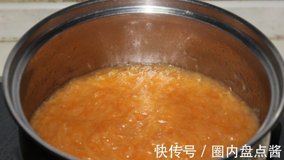 第四步:柚子皮变透明后,把剥好的柚子肉也倒入锅中,然后用小火慢慢的熬,熬至颜色变深,就可以出锅了。出锅之后,把柚子放凉,放凉之后加入一点蜂蜜,需要的时候挖一勺,冲水喝就可以了。