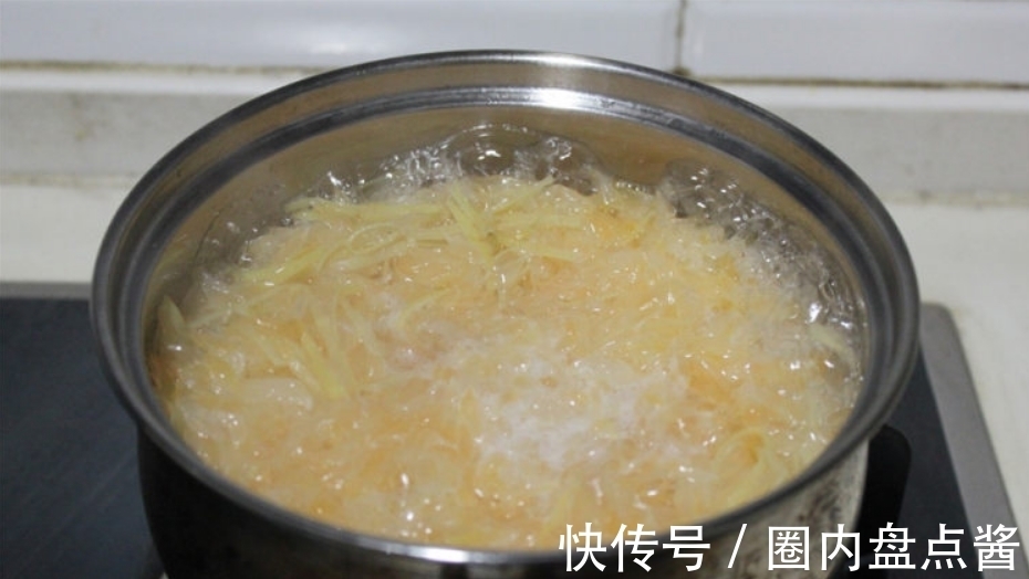第三步:把柚子的籽去掉,留下柚子肉,然后掰成小块,方便一会使用。洗锅热水,放水后再放入冰糖,等冰糖熬滑之后,先把泡好的柚子皮放入锅中煮,这样可以让柚子皮充分的吸收甜味,吃起来就不会有苦涩味。一直把柚子皮煮成半透明。