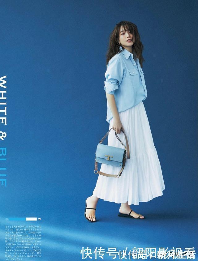 Look2:白色长裙+蓝色衬衣如果担心穿白色的下装容易显胖,那么可以选择小A型的长裙,这个版型的裙子,不仅能够遮挡住臀部、腰腹部的赘肉,还可以遮掩腿部线条的不完美。如果觉得白色长裙过于小女人,那么上身可以选择中性色调的衬衫,以此提高整体的大女人与气质感。