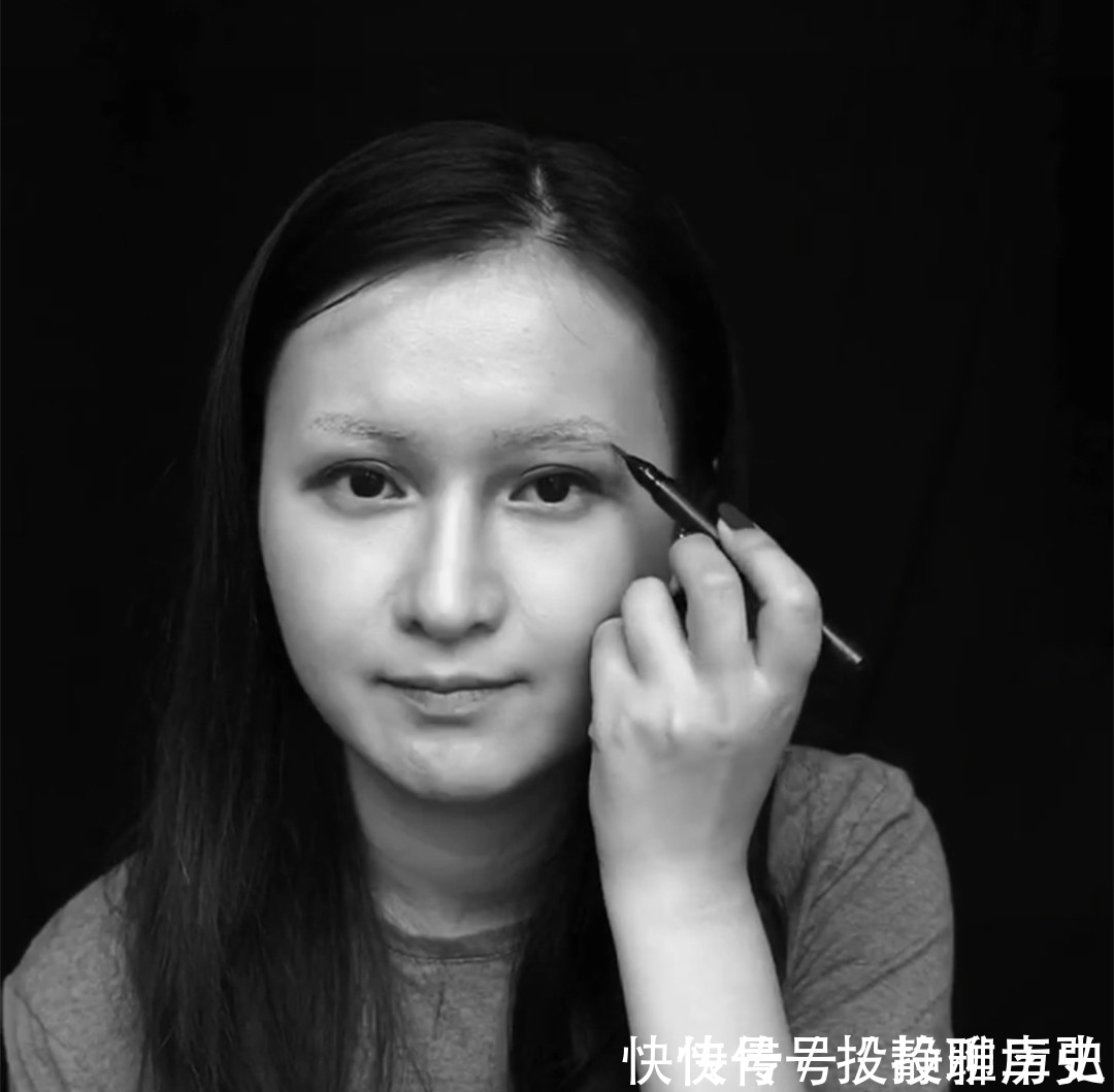 第2步她在自己的眉毛上涂了非常多的粉底液,将自己本来的眉毛盖住,欧美人的眉毛也大都是挑眉,所以说她要先把自己的眉形盖住。