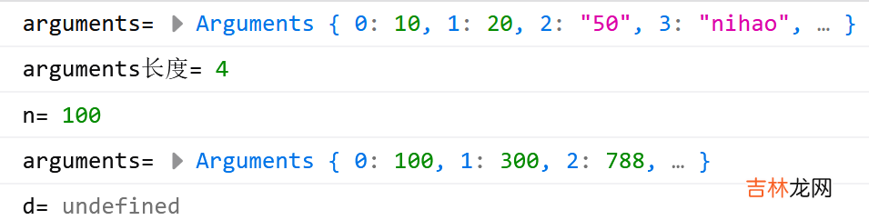 <!DOCTYPE html><html lang="en"><head><meta charset="UTF-8"><title>函数使用的注意事项</title><script type="text/javascript">function f2() {//隐形参数是一个对象数组//遍历函数的arguments隐形参数//arguments是一个数组//注意:如果希望通过console.log输出对象的数据,使用逗号,来连接,而不是加号+console.log("arguments=", arguments);//arguments=Arguments { 0: 10, 1: 20, 2: "50", 3: "nihao", … }console.log("arguments长度=", arguments.length);//arguments长度= 4}f2(10, 20, "50", "nihao");//如果函数有形参,在传入实参的时候,仍然按照顺序匹配//如果实参个数>形参个数,就就将匹配上的数赋给形参,忽略没有匹配上的实参//但是仍然会把所有的实参都赋给argumentsfunction f3(n) {console.log("n=", n)//n= 100console.log("arguments=", arguments)//arguments=Arguments { 0: 100, 1: 300, 2: 788, … }}f3(100, 300, 788);//如果形参个数大于实参个数,没有匹配的形参的值就是undefinedfunction f4(a, b, c, d) {console.log("d=", d);//d= undefined}f4(100, 200, 300);</script></head><body></body></html>