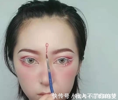 接着在画眼妆先拿白色的在眼皮打底,然后在眼尾的位置上划一些红色加深眼眶,最后再抹上白色的眼线和睫毛膏,那样整天的妆容就已经完成了,在完成这些之后要在额头上画一个标志,看上去只要有点怪异就可以。