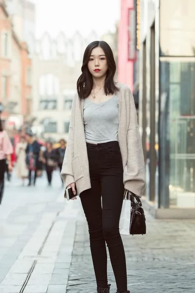 美女穿的是暖灰色的宽松开衫,搭配灰色打底上衣,魔术裤衬托得她又高又瘦,整体很有韩版混搭风格,既时尚又耐看