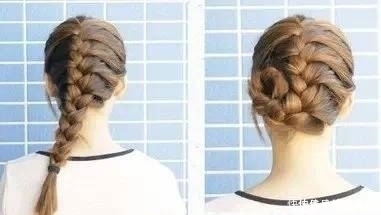 Step1:从左往右编一个斜蜈蚣辫 ,然后把发尾在一侧卷起来,把发尾盘一下