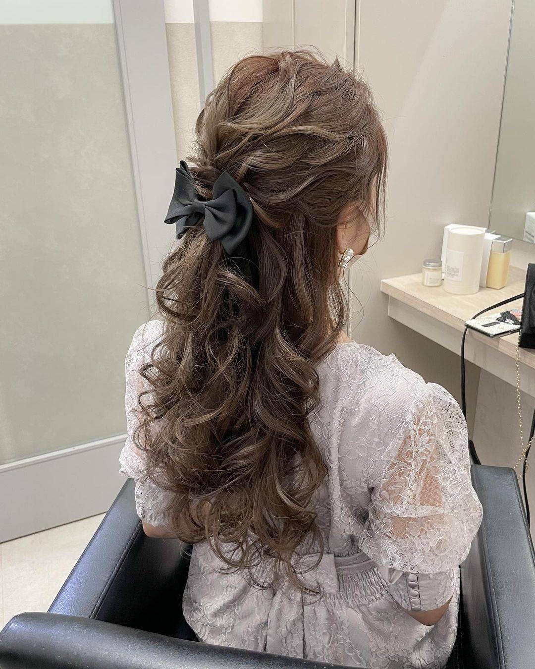 还可以把上爆头做一个半扎发 , 配上一个蝴蝶结 , 就呈现出很知性优雅的风采 。
